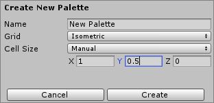 4.将 Cell Size 设置为 Manual。将 X 和 Z 保留为默认值,但将 Y 设置为与瓦片地图 Cell Size 的 Y 值相同的值。此值取决于瓦片地图的投影类型。请参阅创建等距瓦片地图页面以了解更多详细信息。