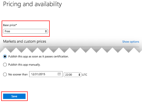 选择 **Pricing and availability** 以设置价格,并选择 **Free**(原因如上文所述)。