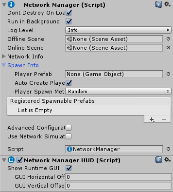 2.向空游戏对象添加 NetworkManagerNetworkManagerHUD 组件。将此对象重命名为“Network Manager”以表明其用途。