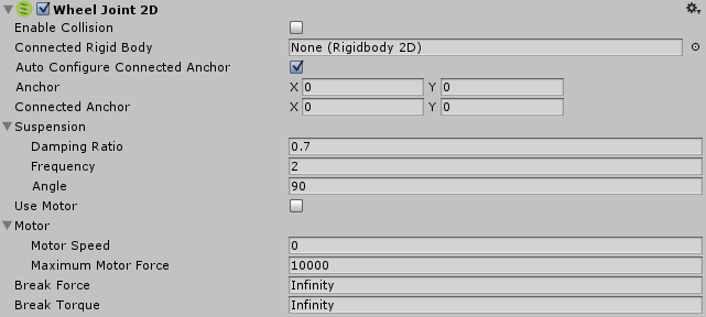 使用 __2D 车轮关节__可模拟滚动的车轮,使对象可通过车轮而移动。可对关节施加电机动力。车轮使用悬架“弹簧”来保持与车身主体的距离。