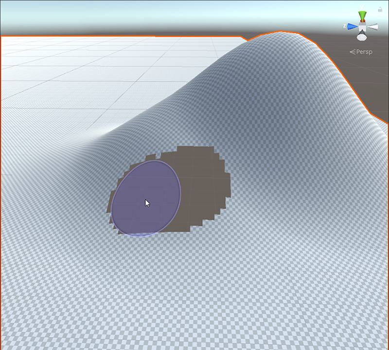 要绘制孔洞,请在地形上单击并拖动光标。在按住 Shift 键的同时单击并拖动可从地形中抹去孔洞。使用 Brush Size 滑动条可控制工具的大小。Opacity 滑动条可确定将画笔应用于地形时的强度。