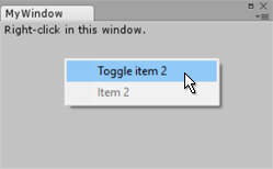 menu.AddItem(new GUIContent("Toggle item 2"), item2enabled, Toggle); if (item2enabled) { menu.AddItem(new GUIContent("Item 2"), false, Item2Callback); } else { menu.AddDisabledItem(new GUIContent("Item 2")); }